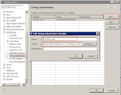 Thursday October 1st, 2009 | Leave a comment You might already know what is maven; it’s a tool to build / compile or package java project… Apache Maven is a software project management and comprehension tool. Based on the concept of a project object model (POM), Maven can manage a project’s build, reporting and documentation from a central piece of information. Here, I want to show how to configure maven to use as external tool in eclipse IDE so easy for you to execute maven commands from the Eclipse interface easy without needing to open a DOS prompt to use. Here is the procedure: 1. Suppose maven 2 already install some where on your PC, (mine is in D:\Work\install\Tools\maven-2.0.4)2. From the menu bar, select Window > Preferences. Select the Run/Debug > String Substitution. Add a new variable e.g. maven_exec.3. Set up a new external launcher from the menu bar, select Run > External Tools. Select Program4. Create each maven task, example: in here, I create only the build classpath On program, create a new program and name as: build_classpath (any name as you wish) In location box: choose our created variable: maven_exec In Working Directory: choose variable: project_loc In Argument, give maven command, in here is: eclipse:clean eclipse:eclipse Click on Apply and Run if you wish now 5. So you can execute the external tool program by execute Run button, result should be in console tab:Enjoy, Share this:ShareTweetShare on TumblrPocketEmailPrint Related