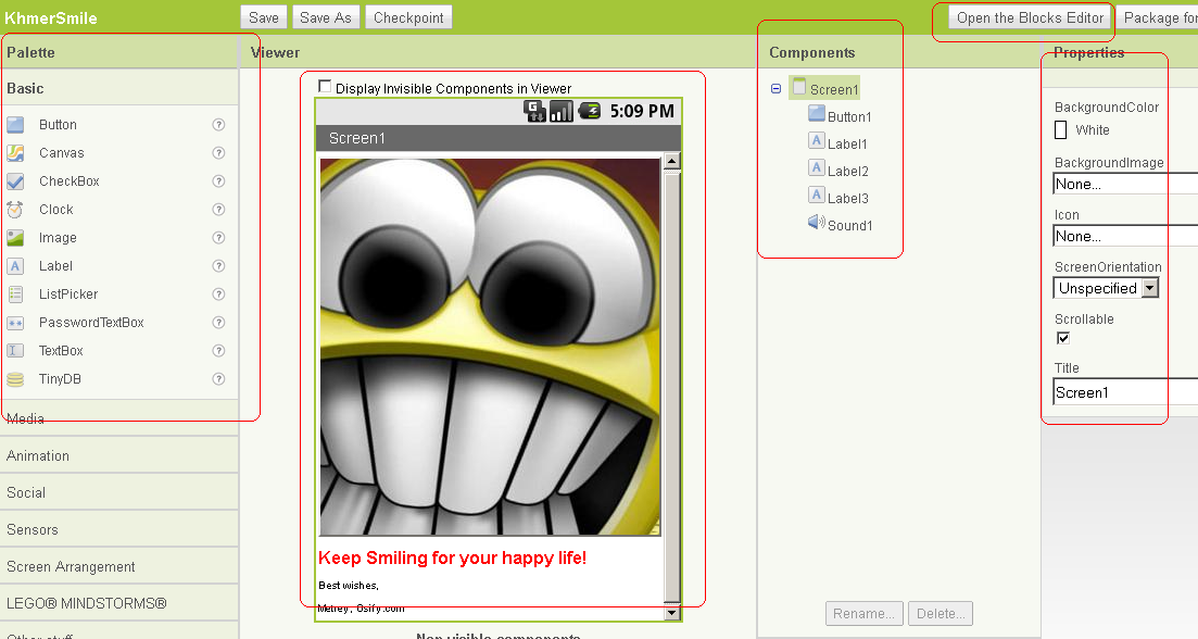 Wednesday June 15th, 2011 | 2 Comments How easy to make such presentation or tutorial applications for Android phone without any code? You may interesting to have a look to an Android Application maker: App Inventor of Google Labs. Of course, App Inventor may can do more than just simple application for you, so let’s check it out! Via the official website, App Inventor is: App Inventor lets you develop applications for Android phones using a web browser and either a connected phone or emulator. The App Inventor servers store your work and help you keep track of your projects. AppInventor Document Diagram You can start your simple application as following: Install AppInventor into your PC: http://appinventor.googlelabs.com/learn/setup/ Better use default location, do not change the install folder Create new project when you are ready from the web application: http://appinventor.googlelabs.com, gmail account requires You build apps by selecting components (ingredients) and then telling them what to do and when to do it. You use the Designer to select components. Some components are visible and some aren’t. You can add media (sounds and images) to apps by uploading them from your computer. You use the Blocks Editor to assemble blocks that define the components’ behavior when … do … blocks define event handlers, that tell components what to dowhen something happens. call … blocks tell components to do things. Check my quick sample application: KhmerSmiling, download to install here KhmerSmile App Test Share this:ShareTweetShare on TumblrPocketEmailPrint Related