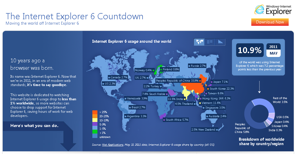 Wednesday June 8th, 2011 | Leave a comment The Internet Explorer 6 Countdown Moving the world off Internet Explorer 6 Stop using MS IE6: http://www.theie6countdown.com The most keeping uses of IE6 countries: China, About 34% South of Korea, 22.3% Vietname, 11.6% India, 11.5% others, see here I still have it also but rarely use it! Share this:ShareTweetShare on TumblrPocketEmailPrint Related